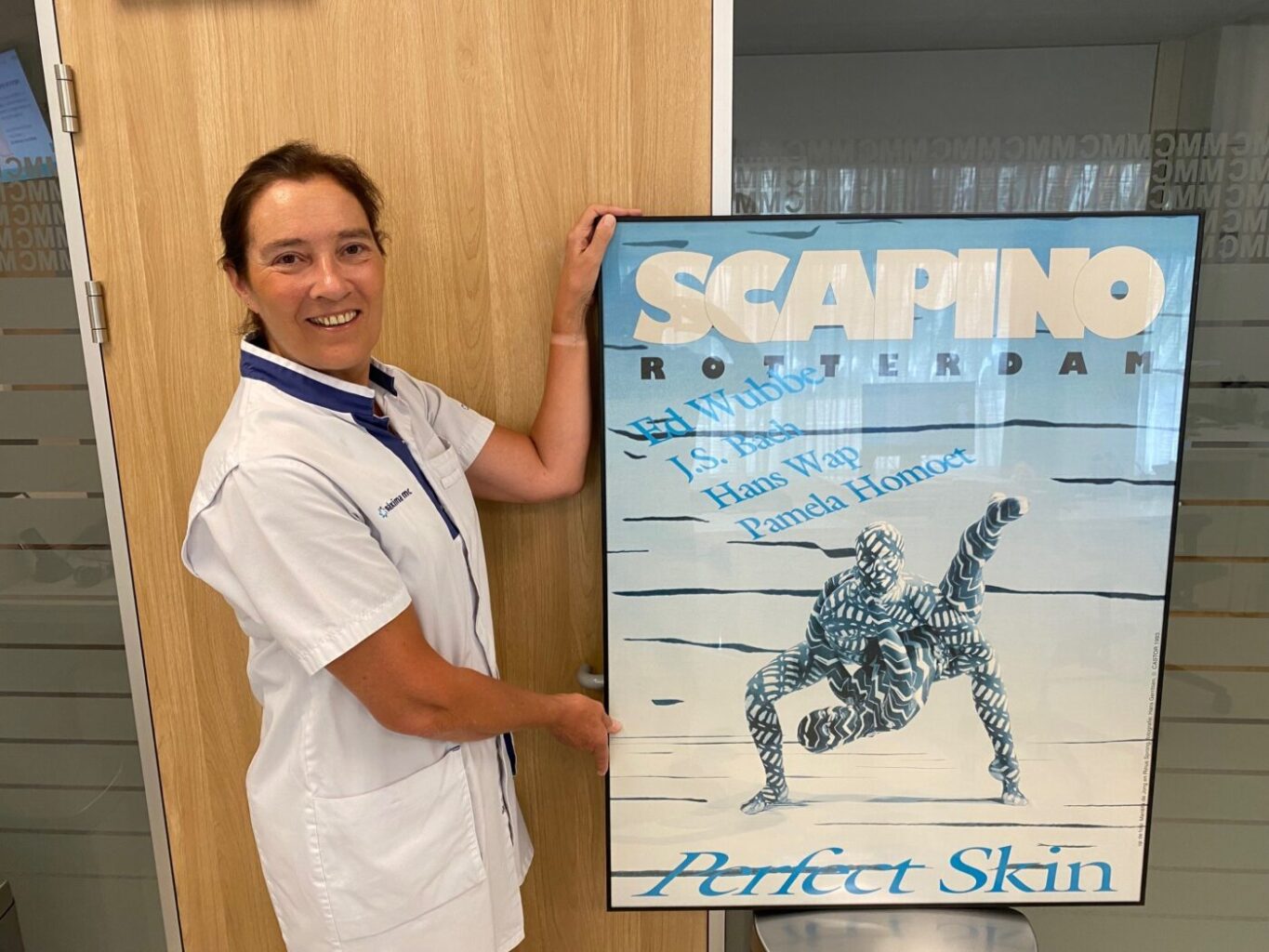Op de foto: Inge Groeneveld-Haenen met de poster ‘Perfect Skin’ van het Scapino Ballet. Deze voorstelling inspireerde haar als student. Ze nam zich voor: als het lukt om dermatoloog te worden, dan komt deze poster in de spreekkamer te hangen. En dat gebeurde — 27 jaar lang sierde hij de muur in MMC, als symbool van haar droom.