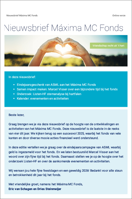 We houden u graag op de hoogte van de laatste ontwikkelingen, activiteiten en successen van het fonds. Onze nieuwsbrieven bieden een uitgebreid overzicht van hoe we met gezamenlijke inspanningen en bijdragen werken aan onderzoek en innovatie binnen het Máxima MC.
