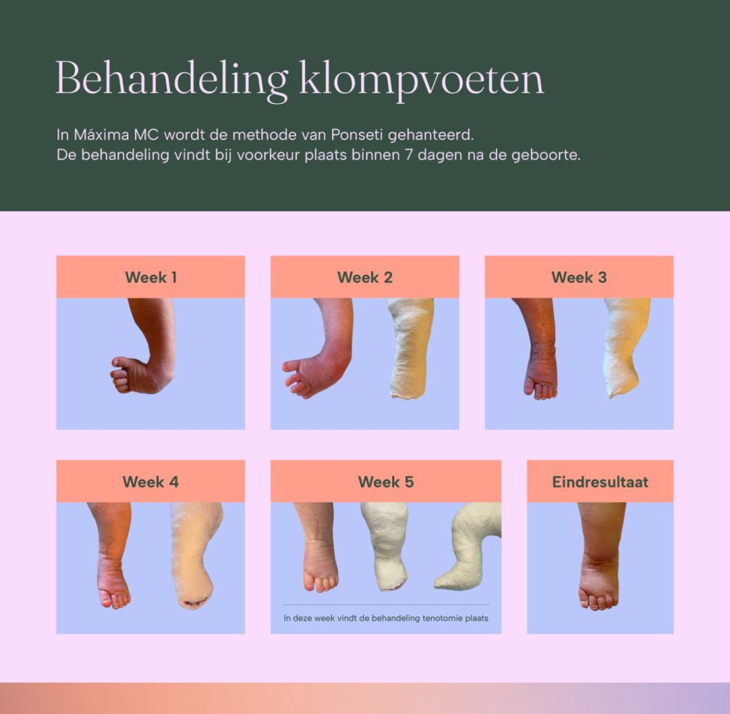In Máxima MC wordt de methode van Ponseti gehanteerd. De behandeling vindt direct na de geboorte plaats en bestaat uit verschillende stappen: